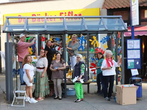 Mit von der Partie sind Brigi Grausam-Tynan, Katja Jaehnert, Matthias Kerling, Arthur Kunz, Manuela Perle, Stella Reichmann, Martina Retzdorff, Hannah Sirrett, Gabriele Teichmann-Reimer, Gary Tynan, Irma Stella Velasco Serrano. Nach den Vorarbeiten haben die Art People inzwischen mit dem Aufbringen der Elemente auf den Scheiben der Bushaltestelle begonnen. Abgeschlossen sein soll dies Mitte Juni.