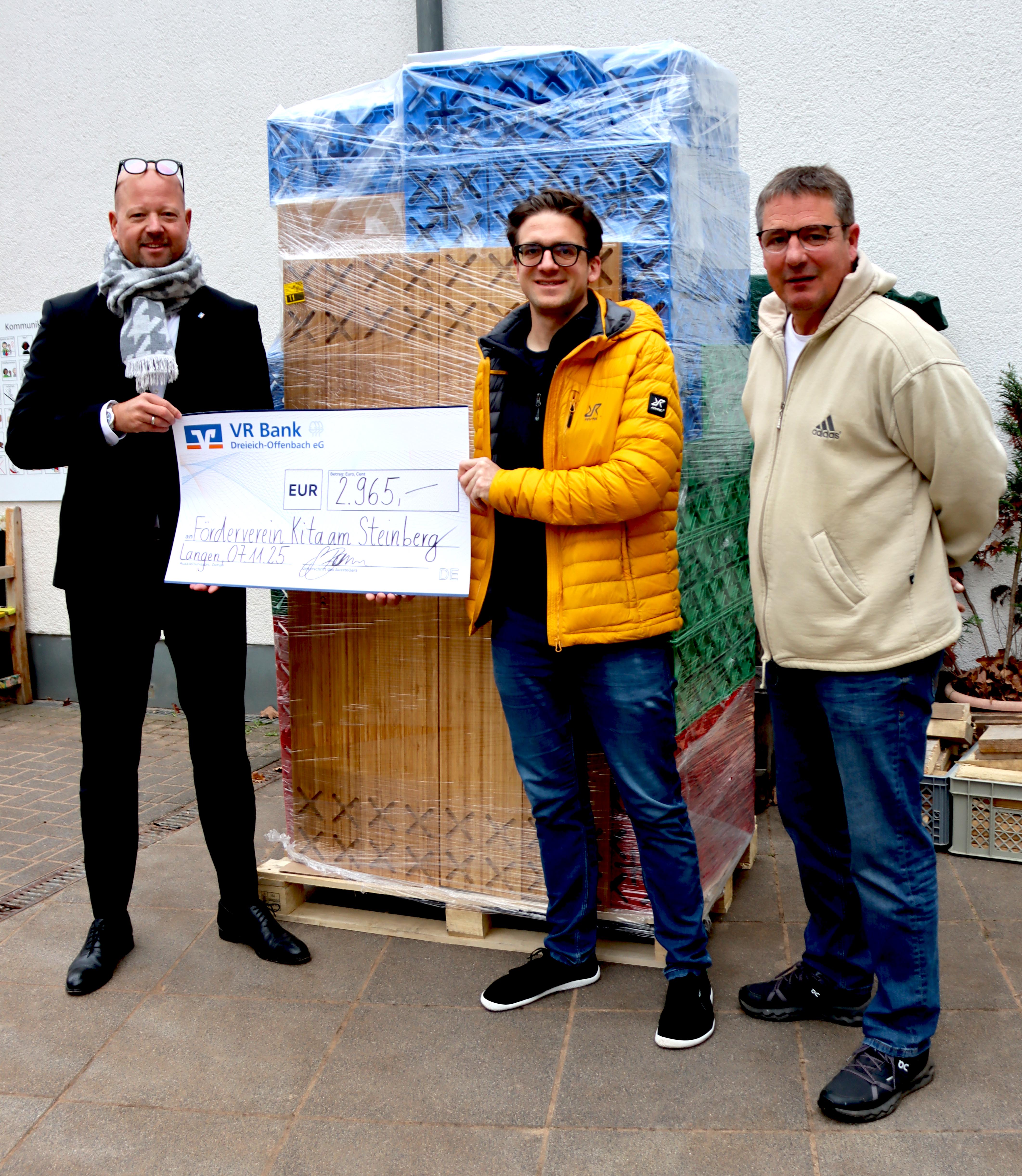 Einen Scheck mit einer schönen Summe für das Kinderglück mit bunten Bausteinen in der Kita Am Steinberg übergab jetzt (von links) Stefan Schmidt, Regionalmarktdirektor der VR Band Dreieich-Offenbach, an Jan Rohrberg (stellvertretender Vorsitzender des Fördervereins der Kita) und an Kita-Leiter Michael Vierrath.