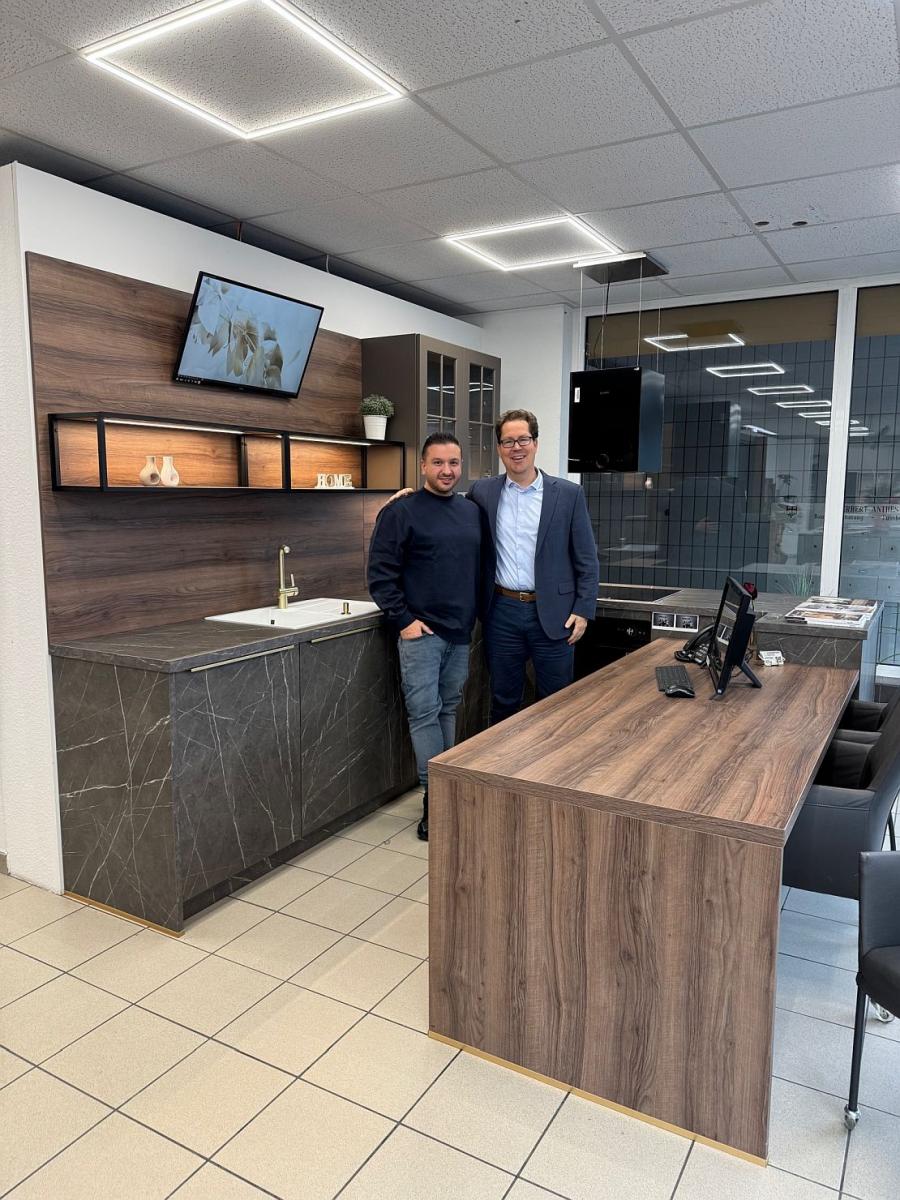 Eine hochwertige Küche mit Elektrogräten im Wert von 8.000 Euro spendete jetzt das Langener Wohn- und Küchenstudio Kurttas an der Gartenstraße 6 der Stadt Langen für soziale Zwecke. Bürgermeister Jan Werner (rechts) dankte Geschäftsinhaber Egemen Kurttas persönlich für das großzügige Geschenk und nahm das Ausstellungsstück entgegen. Jetzt soll es Menschen eine wohnliche Küche bereiten, die auf ihrer Flucht alles zurücklassen mussten oder verloren haben und in Langen neu anfangen wollen.