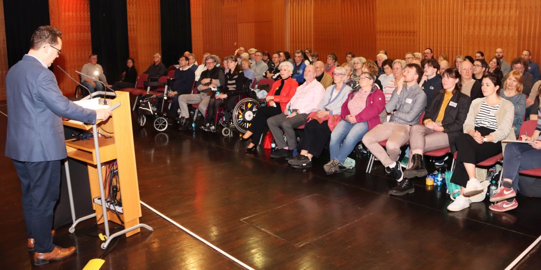 Gelungener Auftakt für die Bürgerbeteiligung im Modellprojekt „Inklusive Innenstadt“: Rund 80 Teilnehmer ließen sich bei einer Informationsveranstaltung in der Neuen Stadthalle von Mitarbeitern der Stadtverwaltung und des Verkehrsplanungsbüros Planersocietät aus Dortmund Ziele und Ablauf erläutern und arbeiteten auch bereits in ersten Gesprächsrunden an Ideen und der Identifizierung von Problemstellen in der Stadt. Gleichzeitig wurde die Online-Beteiligung gestartet, an der sich alle Bürgerinnen und Bürger beteiligen können.