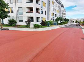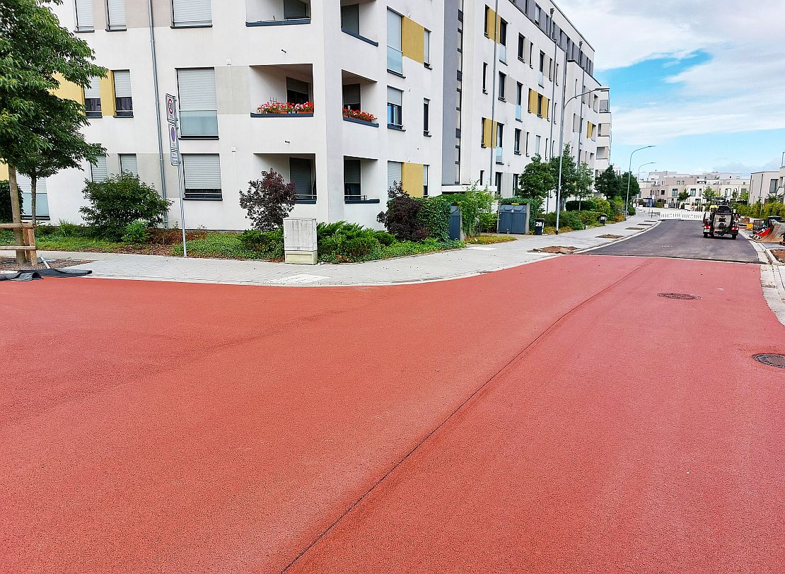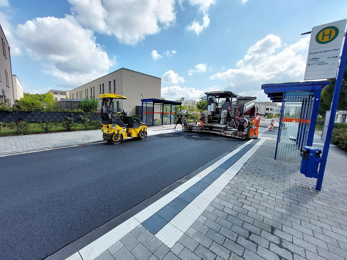 Insgesamt wurden etwa 3.000 Quadratmeter Asphaltstraßen hergestellt. Dabei kam auch Farbe ins Spiel. Denn neben dem dunklen Asphalt gibt es nicht nur die mit einem roten Belag versehenen Kreuzungen, sondern auch noch einen 400 Quadratmeter großen beigen Bereich direkt am Aranda-de-Duero-Platz, der mit diesem eine Einheit bildet. Neben dem Platz entstanden zudem zwei neue, barrierefreie Bushaltestellen mit Wartehäuschen mit begrünten Dächern.
