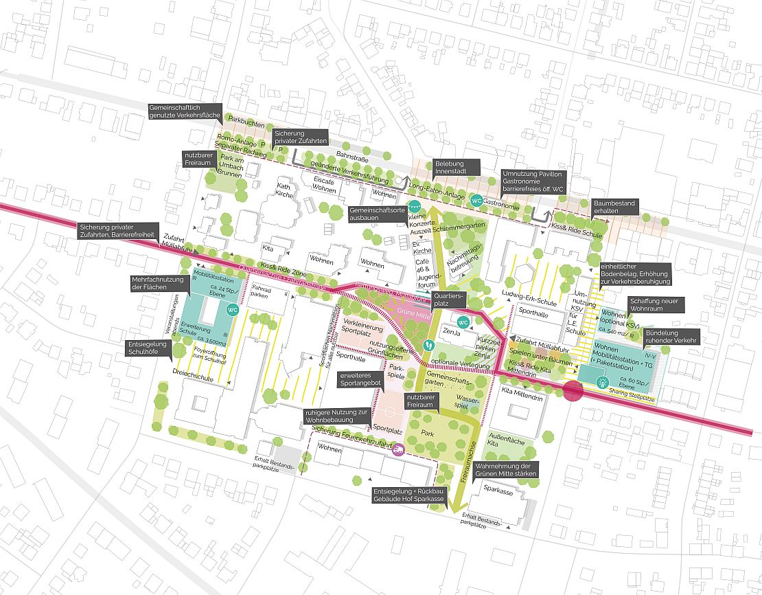 Rund um das ZenJA könnte – durch die Nutzung gemeinsamer Flächen – insgesamt ein grüneres Umfeld entstehen. Die Fahrradstraße als zentrale Quartiersachse sichert die Erschließung des Gebietes und dient gleichzeitig als Feuerwehr- und Rettungszufahrt. Zu prüfen bleibt, ob eine Verlegung der Fahrradstraße nach Süden möglich ist. Falls dem nicht so ist und die ursprüngliche Achse bestehen bleibt, könnte ein zusätzlicher Fußweg quer durch die Grüne Mitte eingerichtet werden. In Nord-Süd-Richtung sollte eine Freiraumachse einen Durchlass vom Rathaus bis zur Romorantin-/Long-Eaton-Anlage ermöglichen.