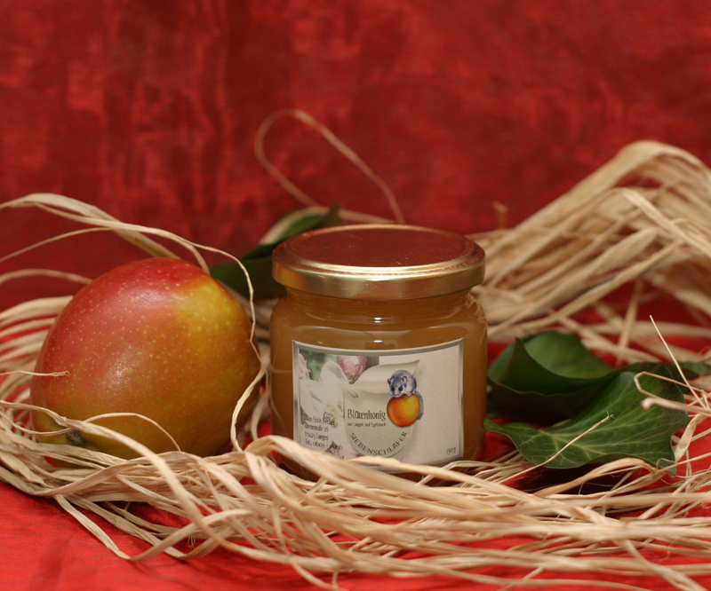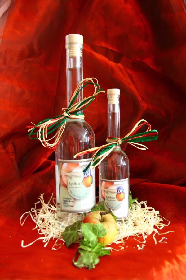 Schluckspecht für 21,50 Euro: Apfelwein (1 l), Apfelbrand (0,2 l), Blütenhonig (250 g), 1 Apfelweinglas