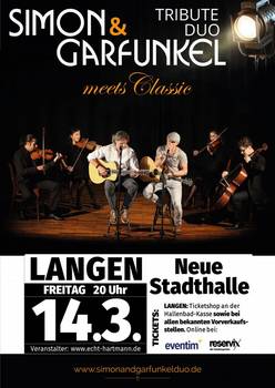 Das Zusammenspiel der beiden Stimmen und zweier Gitarren mit den klassischen Instrumenten lässt die Songs von Simon & Garfunkel zu einem ausdrucksstarken und außergewöhnlichen Musikerlebnis werden. Die Konzertbesucher erwartet ein Abend voller Emotion, eine Hommage an die 60er und 70er Jahre und eine musikalische Vielfalt wie nur selten. Mit Band und Quartett durchstreifen Sie die gefühlvollen Lieder und „rocken“ an anderer Stelle Ihr Publikum.