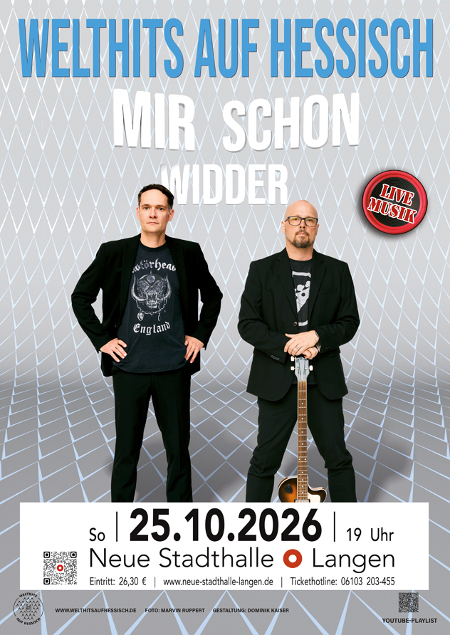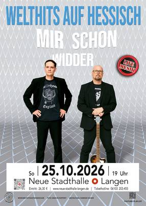 Hessisch ist die Sprache der Liebe und der Poesie. Elis C. Bihn und Tilman Birr haben das erkannt. Jetzt übersetzen sie Welthits der letzten 140 Jahre ins Hessische und singen sie auch noch. Warum machen sie das? Ei, ihr versteht’s doch sonst net! Neue Texte dichten kann jeder. Aber wer kann ‚I come from a land downunder‘ zu ‚isch komm aus ‘de Näh von Darmstadt‘ übersetzen und trotzdem dem Originaltext treu bleiben? Nur diese beiden Stimmungslinguisten mit Bass, Gitarre und zwo maa Gesang. Zwar haben die Originale manchmal gar nichts mit Hessen zu tun, aber wie sagte Ministerpräsident Georg-August Zinn schon 1950: „Hesse ist, wer Hesse sein will.“ Und wenn auch niemand weiß, ob John Lennon, Prince und Elvis Presley Hessen sein wollten – jetzt sind sie es. Nach den gefeierten Auftritten im Biergarten ist das Duo zum ersten Mal auf der großen Bühne in der Stadthalle zu erleben.