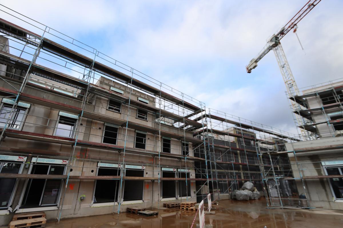 Am südöstlichen Ende des Grundstücks liegt das Mehrfamilienhaus, das im Erdgeschoss eine zweigruppige Kita aufnimmt. In den Obergeschossen liegen in Summe neun Wohnungen, wovon eine Wohnung im 1. Obergeschoss für die Kindertagespflege genutzt werden soll. Zwei der neun Wohneinheiten und die Kita im Erdgeschoss sind barrierefrei gestaltet. Neben dem Mehrfamilienhaus gliedern sich zudem 16 Reihenhäuser in vier Hausgruppen mit zwei bis fünf Einzeleinheiten. Diese bestehen je aus zwei Vollgeschossen, einem Staffelgeschoss und sind über das Untergeschoss ebenso mit der Tiefgarage verbunden.